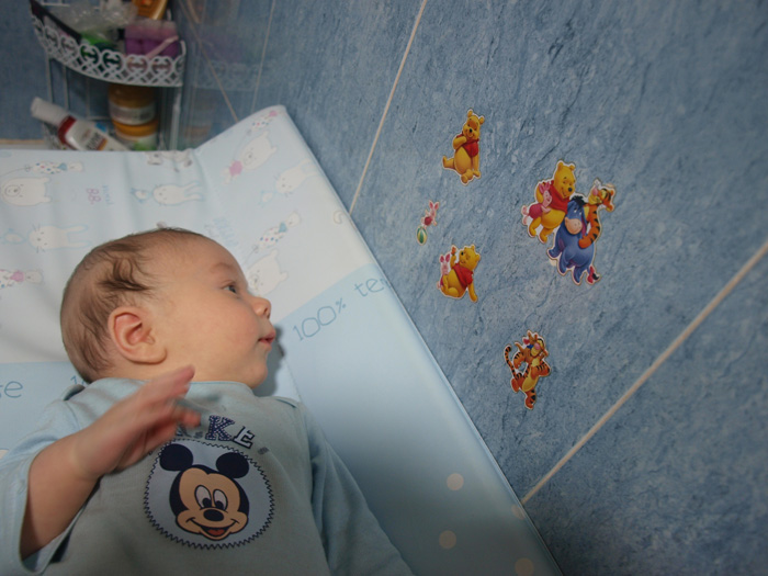 Y también desde antes de los dos meses dice «ajó». Nunca supe que significa, pero parece que es la primer palabra que pueden decir los bebés. Pues él ahora la dice a cada rato y se la pasa diciéndolo a las pegatinas que he puesto en todas partes. Si unas simples figuritas le hacen sonreír tanto, ¡¡no me cuesta nada poner unas cuantas en cada habitación de la casa!!