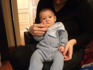 Hoy, por ejemplo, le hemos dado su primera galleta…Es que las había visto en el súper, esas de cereales sin gluten que se deshacen en la boca o en el biberón y que dice que se las puede dar a partir de los 4 meses, así que yo estaba muy ansiosa por ver cómo reaccionaba, que cara ponía, si le gustaba o no ¡¡y le encantó!!