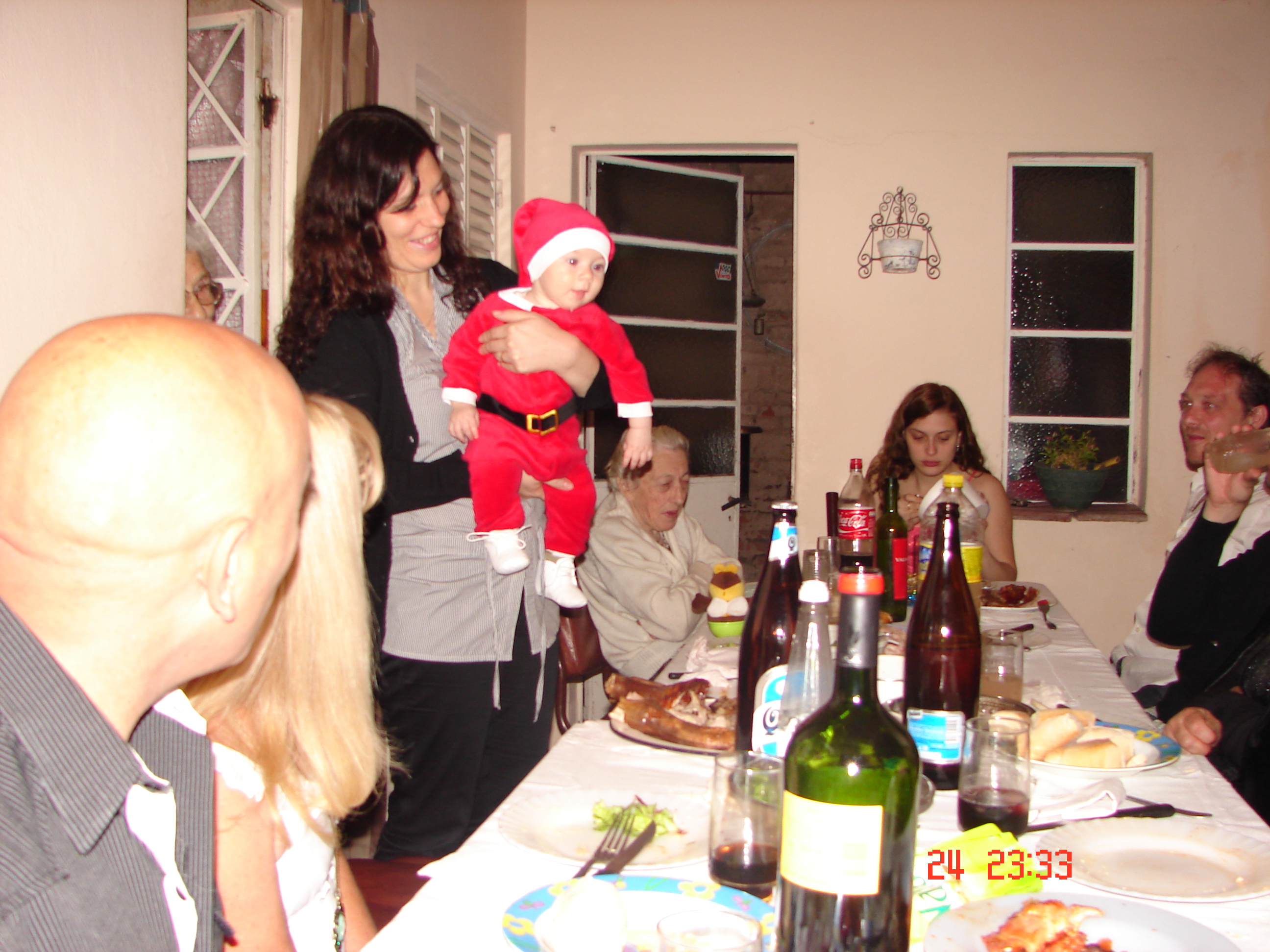 Anoche festejamos en la casa de mi abuela, como he hecho casi toda mi vida, ésa es la tradición familiar y siempre nos reunimos un familión con una mesa larga, cenamos lechón asado, (como un cerdito pequeño, aunque no tanto como un cochinillo); luego todo tipo de cosas dulces y estamos todos pendientes de la hora, por lo que al llegar las 00 hs, se brinda y nos saludamos uno por uno con mucho afecto deseándonos feliz navidad.