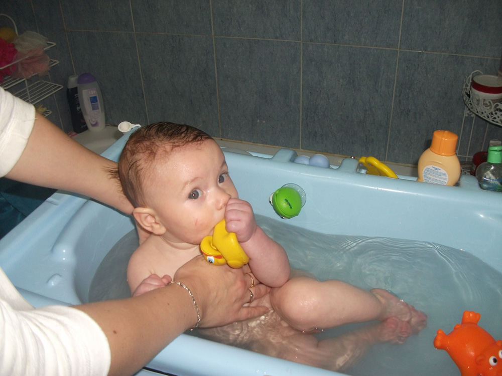 Pero hay un momento en el que sí quiere sentarse: en la bañera, ¡adora el baño!, cada vez que vamos a secarlo abre las piernas y hace fuerza con el culo para abajo, para que le dejemos sentadito jugando.
