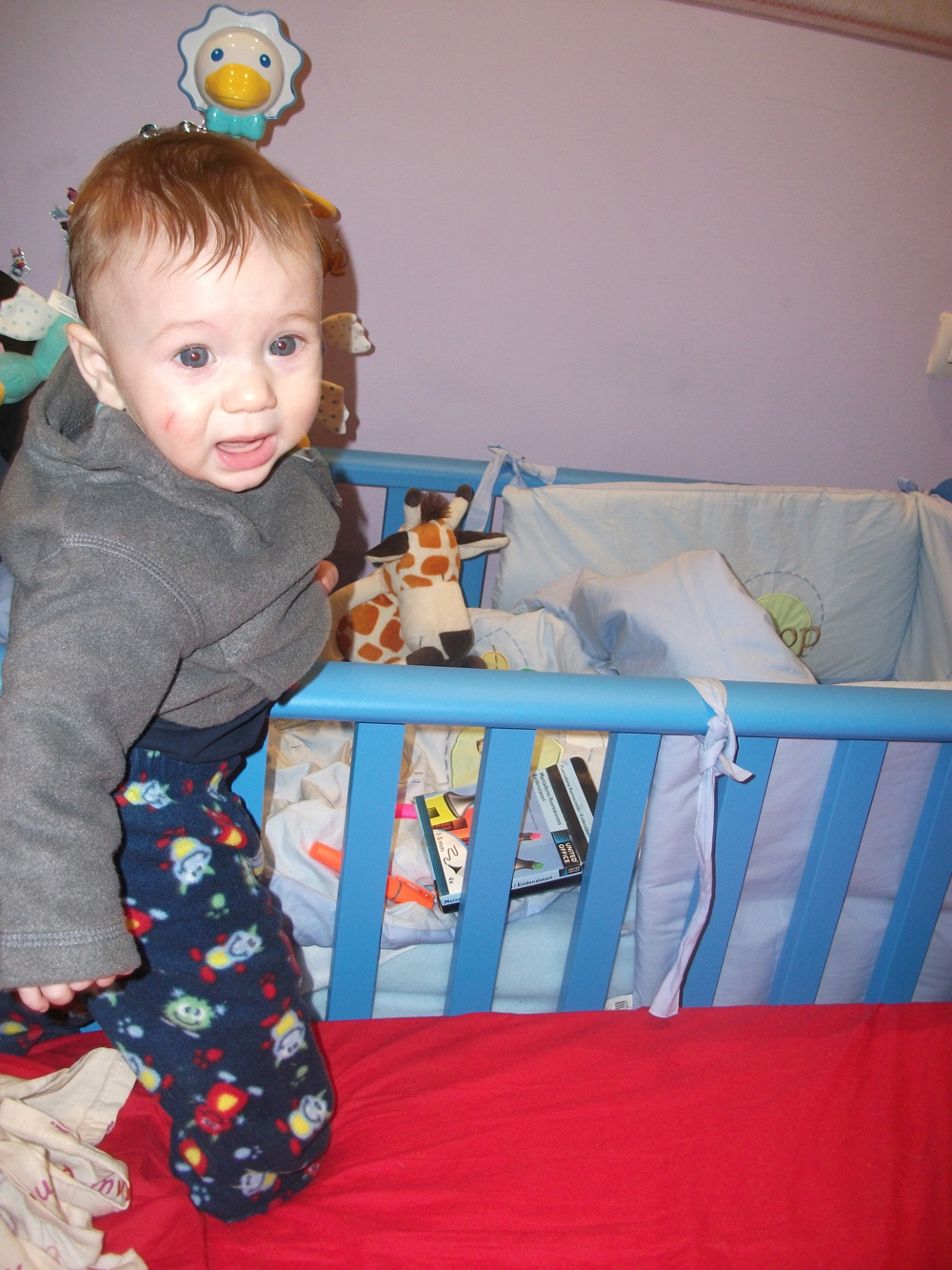 Resulta que estábamos en la cama sentados mirando uno de sus juguetes favoritos, (mami pata, un móvil de cuna) y él estaba sentado, agarrado a los barrotes de la cuna, cuando en un momento se cogió con las dos manos y directamente estiró las piernas, poniéndose de pie, increíble, con 6 meses!