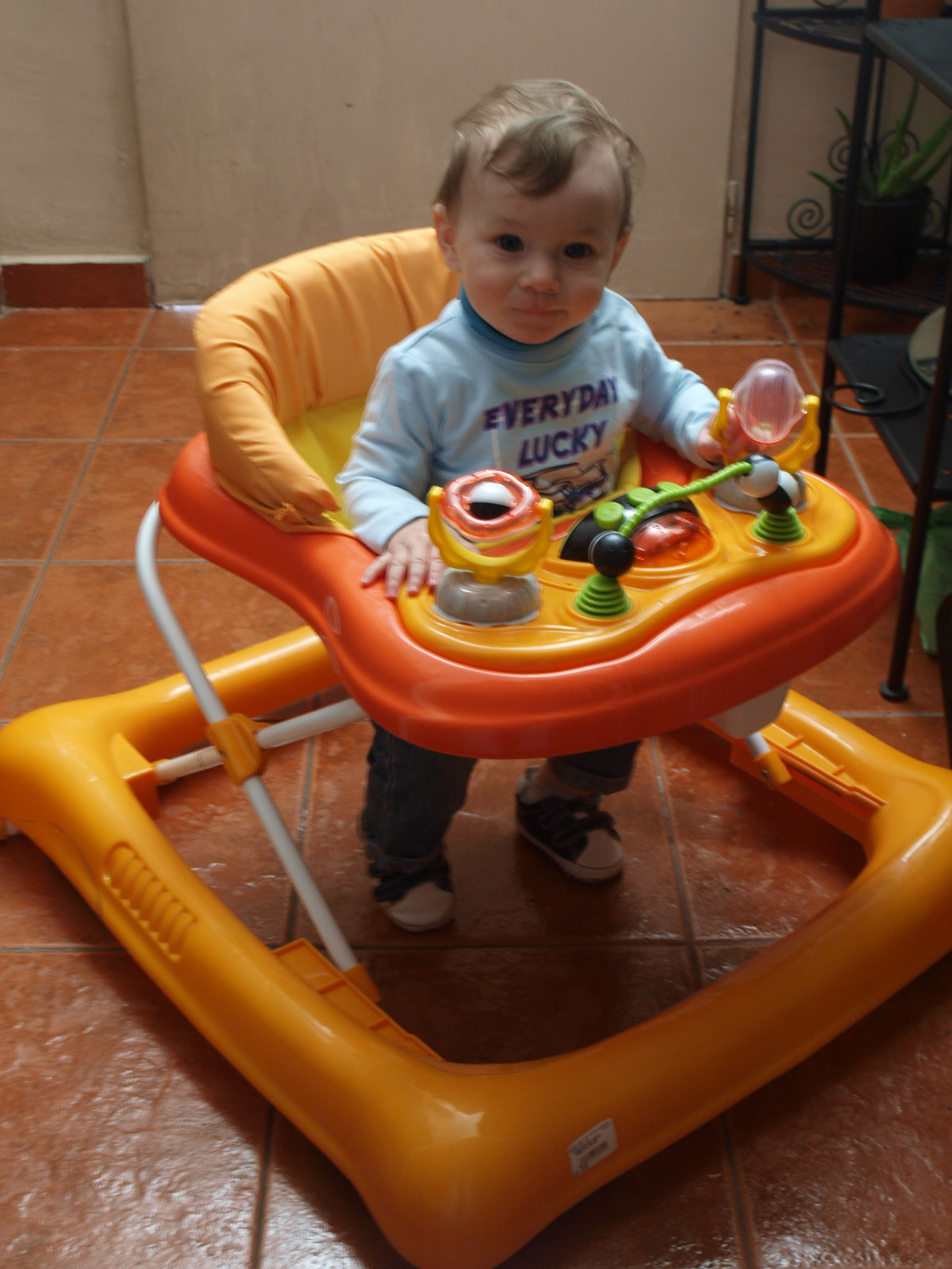 Ay, hijo, ¡cuánto aprendes día a día! Resulta que le regalamos un andador, y no me digan lo que opinan porque yo misma no comparto la idea de tenerlo, además, siempre he dicho que no son nada buenos para los niños porque retrasan el ritmo normal del desarrollo, al facilitarle una forma de andar que no es la correcta, pero cuando íbamos a un supermercado, él siempre lo miraba, lo poníamos a ver que tal y el señor feliz de la vida, así que estuvimos como dos o tres meses que al verlo, Samu se volvía loco, inclusive probamos un montón más porque el que le gustó era horrible, pero el señor empeñado con ese. Y yo pensé que quizás era bueno al menos para que se quede un ratito ahí y me deje cocinarle, porque hasta eso hago con él en brazos…