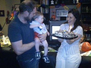 Volviendo al tema del post, la fiesta fue muy bonita, hubo gente hasta la 1am; le hicieron un montón de regalos, la comida estuvo bien, la tarta casera que hice siguiendo la receta de la tradición familiar salio riquísima, pero como estaba apurada, al desmoldarla en caliente se me rompió toda, (por suerte tenía una segunda tarta comprada para la foto), pero nos dimos cuenta que el día que le teníamos que dedicar al peque al final fue más para la gente; comprendimos que es mejor invitar a unos pocos a que el peque se vuelva loco con tanta gente y ruido; así que el día siguiente fue enterito para el flaquito, nos ocupamos de darle mimos, juegos y atenciones hasta el agotamiento…