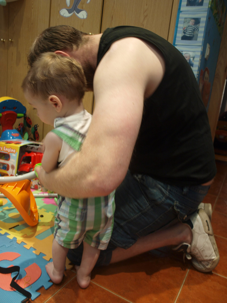 Y el peque está en su salsa; juegan al escondite, (Samu va dando vueltas alrededor del sofá y lo busca y persigue al padre) y cada vez que aparece uno el otro se asusta y se parten de risa. O juegan a ver quién se duerme primero haciéndose los dormidos para luego asustarse mutuamente, o juegan mucho rato en la habitación del peque con tooooodos sus juguetes…