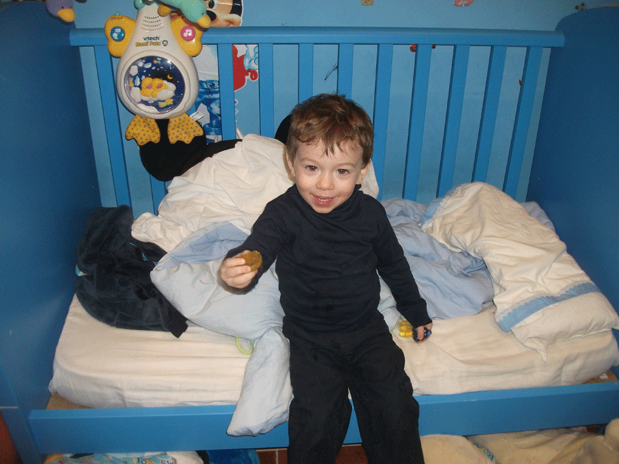 Compramos a Samu un juguete lanzador de carrera de sus personajes favoritos con la condición que se lo dábamos si dormía en su cuna, así que después de cenar fue corriendo a buscar el pijama y a acostarse en su cuna. Papá fue con él para intentar relajarlo y ésta fue la conversación mantenida:
