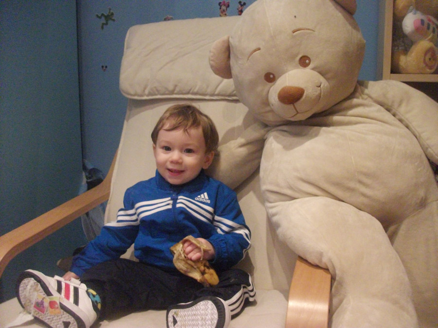 -Habla hasta por los codos: responde al preguntarle, sabe decir sí o no depende de la circunstancia, dice cientos de palabras y hasta llega a armar ciertas frases, se hace entender perfectamente; es una pasada escucharle y en todos los sitios donde vamos flipan al escucharle, no creyendo que sea tan pequeño.